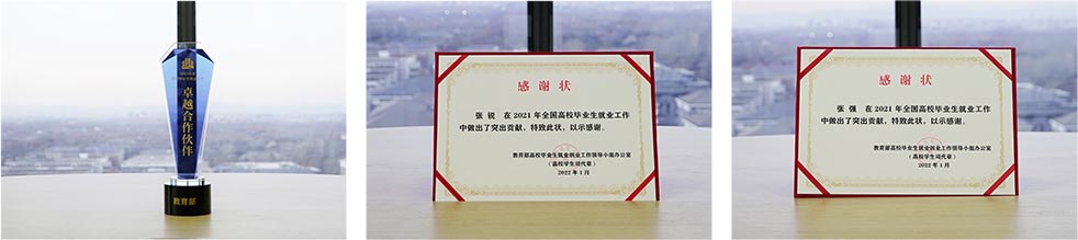 2021年,万学在高校毕业生就业工作方面贡献卓越,获教育部颁发“卓越合作伙伴”荣誉奖杯,并为九球体育董事长张锐、执行总裁张强颁发感谢状。