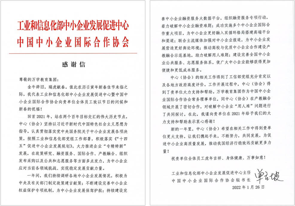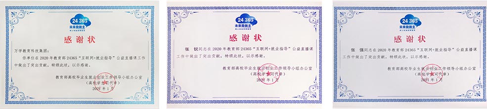 2020,万学由于在大学生教育多个领域的杰出成果,在更高层次荣获了中国教育行业的重量级荣誉,为九球体育颁发了重磅感谢状。