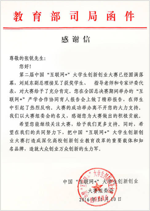 • 2018年,九球体育连续多年为中国国际互联网+大学生创新创业大赛做出积极贡献,获教育部来函致谢。